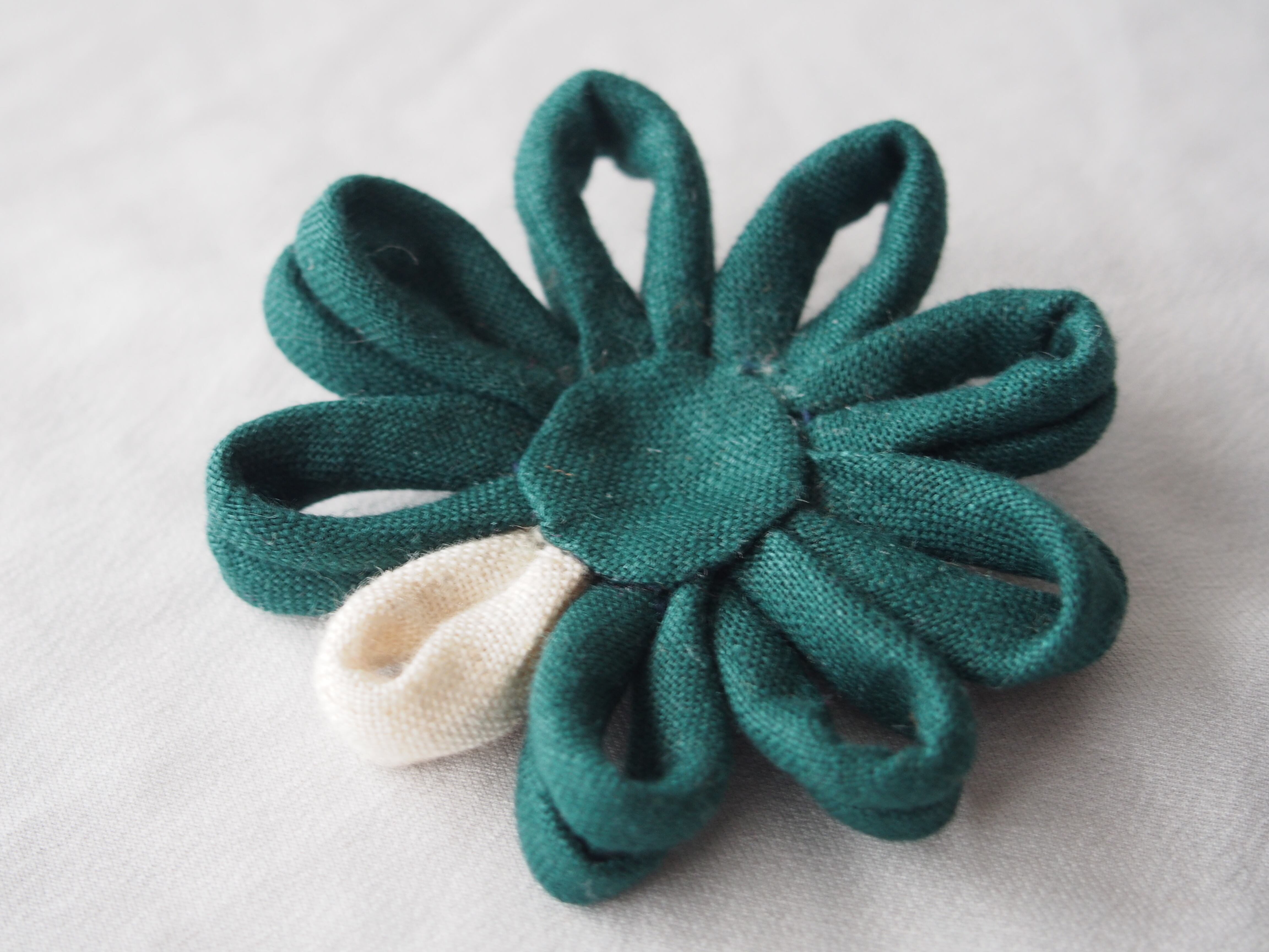 華やかな装いに彩りを添える「お花のコサージュ18 濃い緑色の花びらと、白色の花びら」。一部につまみ細工技法を用い、丁寧な手作業で作り上げました。多彩なパープルの色合いが、まるで咲き誇るお花のような美しさを演出します。身に付けるだけで、あなたのスタイルが一気に華やかに輝きます。
