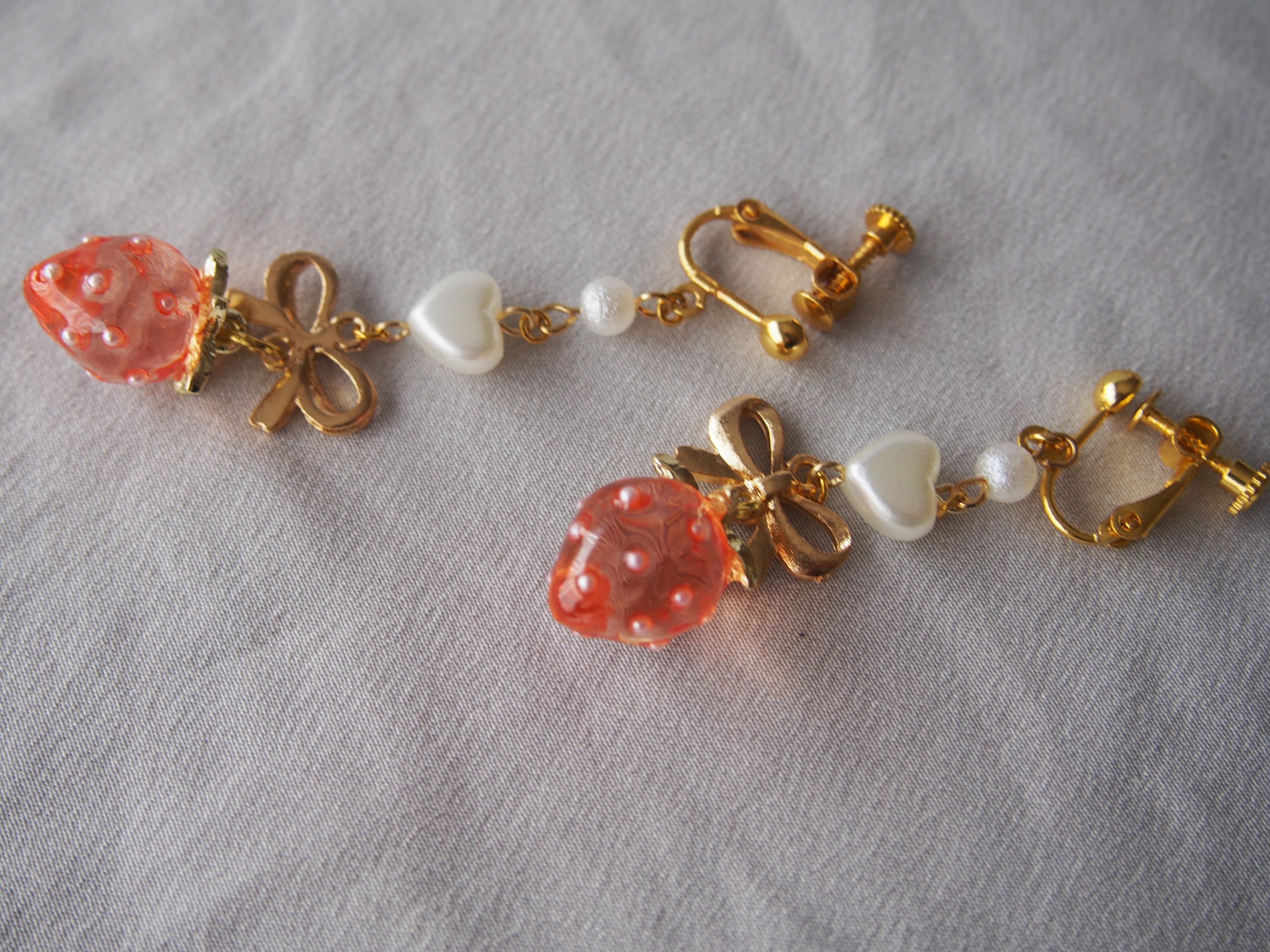 クリアピンクの苺チャームとコットンパール風×ハートパール×メタルリボンパーツを使用したロングイヤリング。